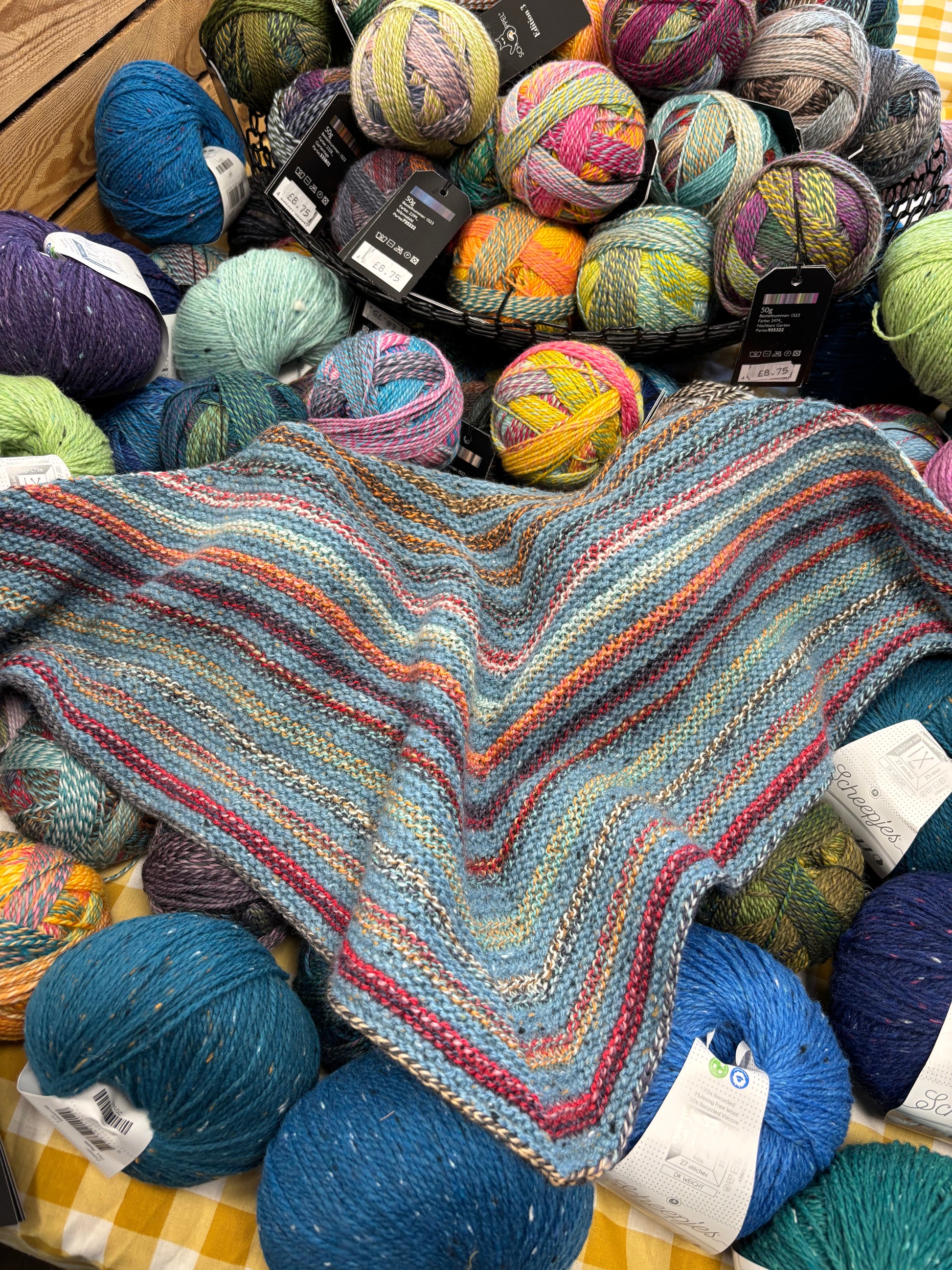 The Polkagris Kerchief by Kate Davies Designs is a simple but effective pattern and looks lovely made with one ball of Schoppel Edition 3 and 1 ball of Scheepjes Terrazzo in either a contrasting or coordinating shade