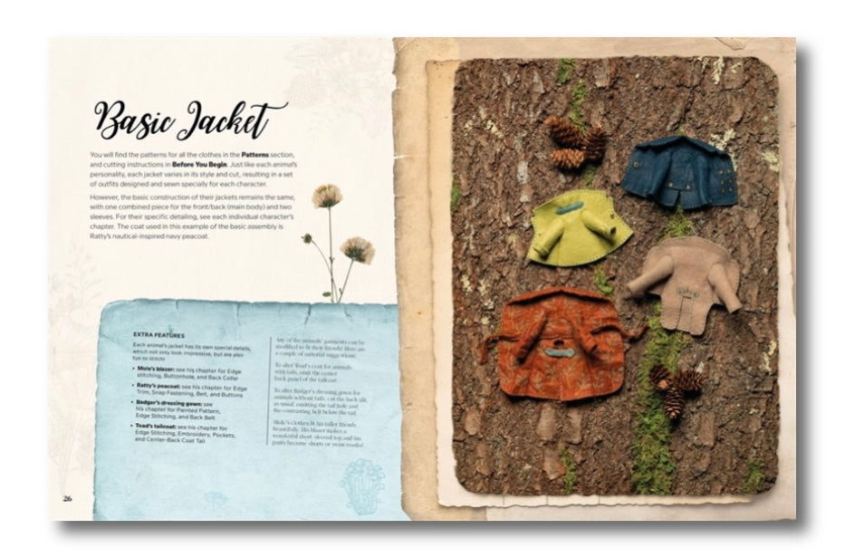 The book includes key characters from the classic Kenneth Grahame tale, with interchangeable clothing, accessories, and a few small furniture pieces. Interwoven throughout the book, a collection of magical photographs and quotes from the original book highlight the animals and their accessories in natural settings to spark the imagination as you create.